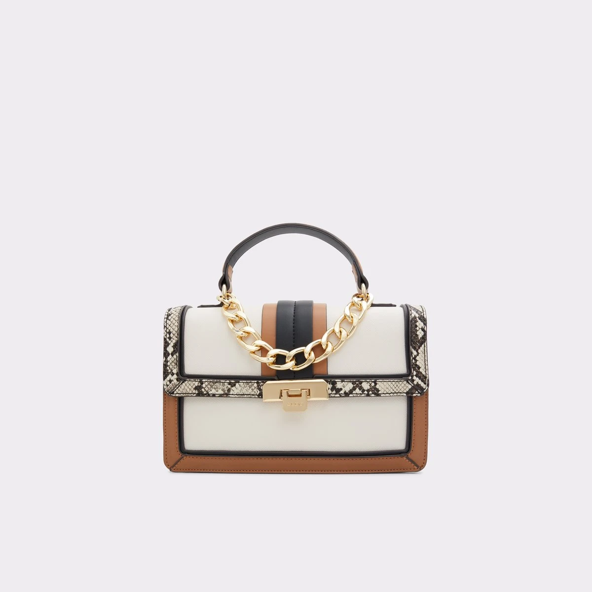 Color blocking details, mixed materials and decorative chain make this top handle bag a bold (and chic) choice for everyday styling!